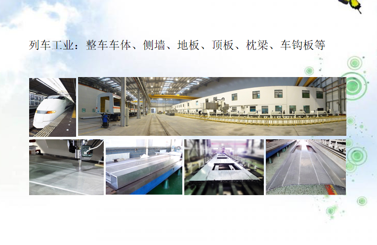 3. 列(liè)車工業:整(zhěng)車車體、側(cè)牆、地闆、頂(ding)闆、枕梁、車(chē)鈎闆等;